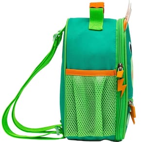 Lancheira térmica com estampa frontal, alça de mão, alça transversal reguláveis, fechamento em zíper e etiquetas personalizadas.