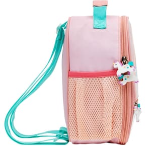 Lancheira térmica com estampa frontal, alça de mão, alça transversal reguláveis, fechamento em zíper e etiquetas personalizadas.