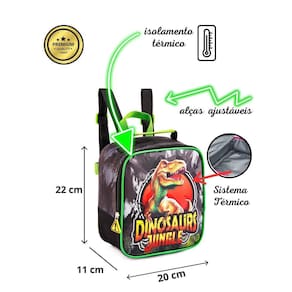 A Lancheira Térmica Dinossauro é produzida em poliéster de alta qualidade, garantindo resistência e durabilidade. Possui alças de costas ajustáveis, proporcionando conforto durante o transporte. Seu material interno é térmico, mantendo o lanche fresco por mais tempo. Os zíperes possuem puxadores personalizados, tornando o abrir e fechar mais fácil para as crianças. Além disso, conta com uma estampa estilizada de dinossauro, que vai encantar os pequenos aventureiros. Vale ressaltar que o kit não acompanha potinho e garrafinha.