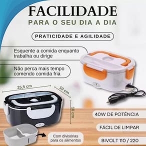 Lancheira térmica elétrica portátil bivolt para alimentos Marmiteira elétrica portátil bivolt Aqueça sua comida enquanto trabalha ou dirige, no carro, caminhão, uber, escritório, casa ou escola com a marmita elétrica térmica portátil bivolt. Esta marmita é perfeita para quem busca praticidade, agilidade e conforto. Com um modelo compacto e prático, ela comporta até 1,05l de comida, ideal para levar seu jantar ou almoço completo a qualquer lugar. Use-a em seu carro, caminhão com saída 12/24v ou em casa e no trabalho com tomada 110/220v. Precaução importante: pressione a válvula de silicone no centro da tampa antes de aquecer para evitar danos à marmita e perda da . Conteúdo da embalagem 1 marmita elétrica bivolt 1 manual de instruções 1 cabo para tomada convencional 110/220v 1 cabo para carro 12v/24v 1 colher Características Trava nas laterais para garantir que a tampa fique bem fixa Repartições para separação de alimentos Suporte para talher Pode ser utilizado sem a necessidade de água Design compacto e elegante Alça para transporte e travas de segurança Especificações Voltagem: 12v/24v - 110v/220v Potência: 40w Capacidade: 1,05l compartimento grande: 0,6l; compartimento pequeno: 0,45l Peso: 920 gramas Tamanho: 23,5 x 6,5 x 10cm Variações: preto e branco, branco e cinza, verde e musgo, branco e vermelho, branco e azul enviamos cor disponível no Dicas de segurança Não utilize água para aquecer a comida. Não aqueça no forno de micro-ondas. Não ligue sem comida. Não congele na geladeira. Não mergulhe a parte inferior em água para limpeza; utilize um pano úmido. Descubra a revolução na culinária móvel com a marmita elétrica térmica bivolt adquira agora e transforme seus momentos de alimentação em uma experiência única e prática, garantindo refeições quentes e deliciosas em qualquer lugar Marca: Não Informado Ean: 7905560411439