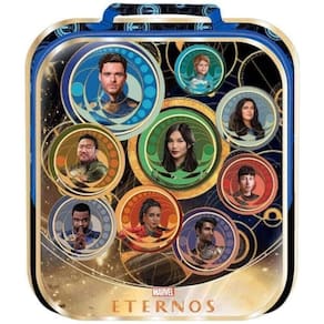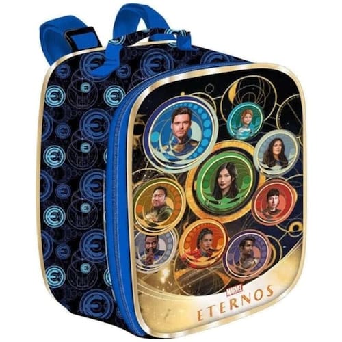 Linha Eternals Movie - Lancheira , produzida em poliéster estampado resistente e vivos metalizados. Seu painel frontal feito em PVC cristal 3D , alça de costas regulavel, alça de mão e puxadores personalizados, compartimento interno forrado com material que permite manter o frescor dos alimentos por mais tempo.