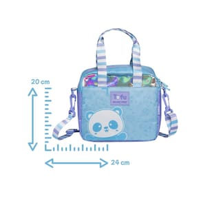 Fofa e funcional, a lancheira térmica Panda Tofu é perfeita para acompanhar as pequenas na escola! Com estampa divertida do panda, material resistente e interior térmico que conserva os alimentos fresquinhos por mais tempo. Possui alça de mão, alça regulável para uso transversal e identificação no verso. Ideal para uma rotina escolar com estilo e praticidade!