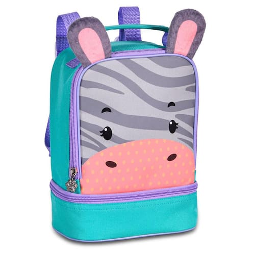 - designer personalizado zebra. - com orelhinhas. - possui 2 compartimentos. - 1 alça de punho. - 100% poliéster. - alça traseira para acoplar a mochila. - 1 alça de punho. - com revestimento interno térmico para conservar bebidas e lanches por muito mais tempo.
