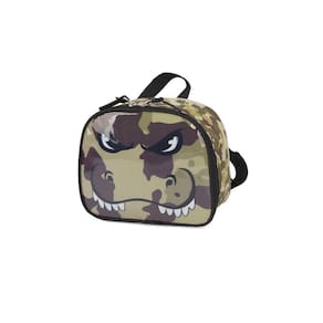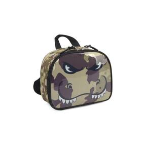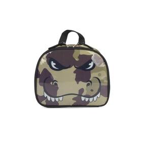 Lancheira Térmica da Luxcel confeccionada em poliéster, personalizada com tema camuflado de Dinossauro, possui alça de mão e alça de costas, conta com fechamento através de zíper bidirecional.