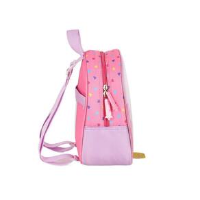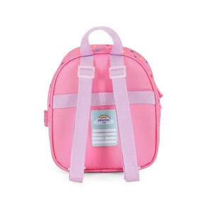 Lancheira térmica com estampa frontal, alça de mão, alça de costas reguláveis, fechamento em zíper e etiquetas personalizadas.