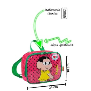 Com estampa estilizada da Magali da Turma da Mônica, a lancheira é perfeita para os fãs do desenho. Suas dimensões são de 22 x 20 x 8cm altura x largura x profundidade , proporcionando espaço suficiente para acomodar os lanches das crianças.