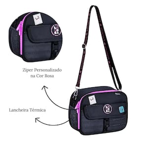 - Confeccionada em nylon com matelassê, cadarço logado acetinado, pins de metal e etiquetas de borracha - fechamentos em zíper bicolor com puxadores personalizados - 01 Bolso principal amplo com revestimento interno térmico - 01 Bolso frontal com revestimento interno térmico, com fechamento em fivela magnética - Alça ajustável - Medidas aproximadas da Lancheira: 20 x 25 x 9cm