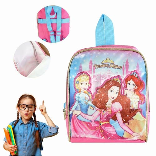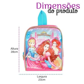 Design compacto para a hora do lanche. Ideal para acompanhar as atividades escolares. Estampa das princesas mágicas e detalhes em dourado Espaço interno amplo para carregar lanches. Alças ajustáveis para transporte fácil.