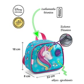 Lancheira Bolsa Térmica Unicórnio Basic - Produzida em poliéster; - Possui 1 bolso lateral 1 frontal e 1 divisão grande; - Forro interno em pvc; - Estampa estilizada; - Zíperes com puxadores reforçados; - Alça transversal removível; - Alça para mão; - Não Acompanha garrafinha e porta lanche ;
