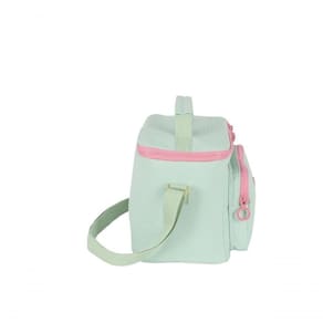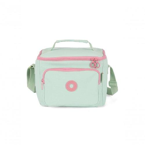 A lancheira é confeccionada em algodão, material leve, e possui bolso frontal e abertura superior, facilitando o acesso interno. O design com logo em metal, alça de mão e alça transversal ajustável conferem praticidade e conforto no transporte.