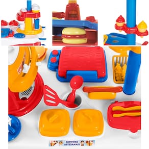 A Lanchonete da Tateti vem com chapa para prensar o hamburguer, sanduicheira, frigideira para fritar as batatas fritas, sorveteria, máquininha de fazer suco, cafeteira, e muito mais!