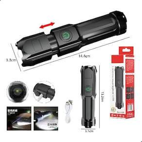 Potência luminosa: até 800 lúmens Tipo de LED: COB de alto brilho Temperatura de cor: 6000K (luz branca) Bateria: 18650 recarregável (inclusa), 800 mAh Carregamento: via cabo USB (incluso) Tempo de recarga: aproximadamente 3,5 horas Indicador de carga: vermelho (carregando) / azul (carga completa) Dimensões: 13 a 15 cm (comprimento, conforme ajuste do zoom) x 3,5 a 5 cm (diâmetro) Peso: aproximadamente 90 g Recursos: zoom telescópico, corpo retrátil, design compacto