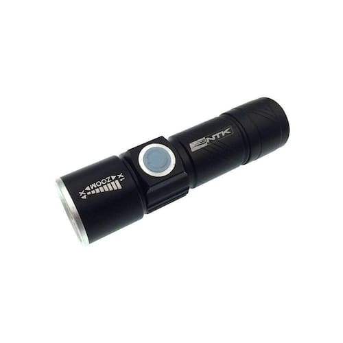 Recarregável via cabo USB, oferece três modos de iluminação (alto, baixo e piscante), além de zoom ajustável de 4x para maior precisão.