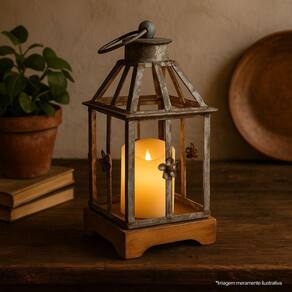 Com 28cm de altura x 16cm de largura, a lanterna acompanha vela eletrônica LED de 10cm x 7,5cm, que oferece uma iluminação suave e realista, sem os riscos da chama aberta. Alimentada por 3 pilhas AAA (não inclusas), a vela é prática e segura para uso interno. O modelo conta ainda com argola metálica para pendurar, permitindo variações criativas na ambientação.