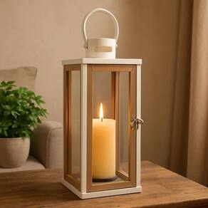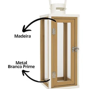 A lanterna possui estrutura em metal branco metalizado de alta qualidade, com acabamento interno em madeira clara que valoriza ainda mais a iluminação e cria um visual aconchegante. Suas laterais em vidro transparente proporcionam ampla visibilidade para velas decorativas ou LED (não inclusas), permitindo criar cenários sofisticados para qualquer ocasião.