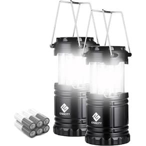 Etekcity 2 pacotes Portátil Outdoor Lanterna LED Camping Lanternas com 6 Baterias AA - 𝑩𝒓𝒊𝒈𝒉𝒕 & 𝑫𝒊𝒎𝒎𝒂𝒃𝒍𝒆: Equipped with 30 bright LED bulbs, this lantern can get as bright as 154 lumens with a 360° lighting effect to dispel the darkness during emergencies like hurricane, power outages, etc. - 𝑪𝒐𝒎𝒑𝒂𝒄𝒕 & 𝑳𝒊𝒈𝒉𝒕𝒘𝒆𝒊𝒈𝒉𝒕: With its collapsible design, the lantern is portable like a smartphone which makes it an ideal camping gear and it's lightweight; Easily pack it in your backpack while camping or hiking - 𝑬𝒂𝒔𝒚 𝒕𝒐 𝑼𝒔𝒆: Simply collapse or expand the lantern turn it on/off. You can also control the amount of light emmitted by adjusting the height of the lantern for any occasion - 𝑳𝒐𝒏𝒈 𝑳𝒂𝒔𝒕𝒊𝒏𝒈: Powered by 3 well-charged AA batteries, this lantern provides up to 50 hours of bright light as hurricane preparation items - 𝑫𝒖𝒓𝒂𝒃𝒍𝒆 & 𝑾𝒂𝒕𝒆𝒓 𝑹𝒆𝒔𝒊𝒔𝒕𝒂𝒏𝒕: This LED lantern is constructed with strengthened ABS material which provides it the capability to survive from dropping and getting wet; This lantern is FCC certified - 𝑬𝒙𝒕𝒓𝒂 𝑺𝒕𝒐𝒓𝒂𝒈𝒆: Store keys, change, or spare batteries in the convenient storage compartment at the top of the lantern