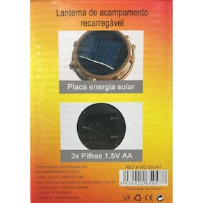 Lanterna lampião Monaliza Import é ideal para pescaria, camping, residências, automóveis, etc. Possui: - Alça para transporte; - Sistema Retrátil e Multifuncional; - Recarregamento por energia solar ou na energia elétrica; - Entrada USB para carregamento de celular; - Pode ser utilizado 3 pilhas AAA