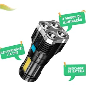 Brilho forte com 4 núcleos de LED: iluminação ampla e intensa para diversas situações Resistente à água (IP44): suporta respingos e chuva leve — perfeita para ambientes externos Recarga via USB super rápida: prático no dia a dia; use fontes USB comuns Corpo em ABS: material robusto, antiderrapante e resistente ao desgaste LED OSL + COB: combinação para alto rendimento, excelente intensidade e maior durabilidade Bateria de lítio: longa vida útil e autonomia de até 4 horas por carga Indicador de bateria: acompanhe o nível de carga facilmente