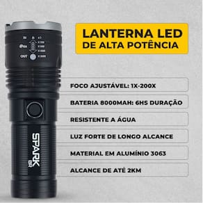 Destaques do Produto: - Potência de 2000 lumens: iluminação forte e ampla para uso em locais com pouca luz. - Zoom ajustável: foco regulável de x1 até x2000, adaptando-se às diferentes distâncias. - Modos de luz: escolha entre luz forte, luz média ou luz suave conforme a necessidade. - Bateria recarregável: bateria interna de 8000mAh com autonomia de até 6 horas. - Recarga prática: compatível com cabos USB e USB Type-C. - Design leve e compacto: estrutura em alumínio resistente, medindo 18,5cm x 5,5cm e pesando 348g.