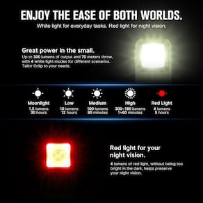 - Fontes de luz duplas: uma mini lanterna de bolso potente, luz branca para uso diário e luz vermelha para visão noturna