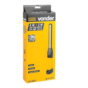 Lanterna recarregável de inspeção, ultrafina articulada, LR 600 Vonder Itens: 1 Lanterna. Acompanha: 1 cabo USB e 1 adaptador Indicada para utilização em trabalhos de inspeção automotiva. Possui LED com índice de reprodução de cor de 80%, que deixa as cores verdadeiras e naturais. Conta ainda com base magnética super potente, alça ajustável em 120°, indicador de carga da bateria e entrada micro USB. É resistente a quedas IK07 e projeções de água IP54 . Temperatura de cor: 4.500 K/6.500 K fria/azulada . Bateria recarregável 3,7 V 2.600 mAh - Lítio. Quantidade de LEDs da lanterna: 1 LED COB e 1 LED SMD topo Material da lanterna: Plástico ABS de alta resistência com revestimento emborrachado e ganchos de nylon Cor da lanterna: Preta Diâmetro da lente da lanterna: N/A Comprimento total da lanterna: 340 mm Tempo de carga: 4 horas Autonomia aproximada: 5,5 h 1°Estágio / 2,5 h 2°Estágio / 10,5 h Topo Fluxo luminoso lúmens : 250 lm 1°Estágio / 600 lm 2°Estágio / 120 lm Topo Alcance: N/A Tensão V : Carregador: 100 V~ - 240 V~ - bivolt automático - E CDC : legal: 90 dias + contratual: 9 meses Ean: 7893946603052