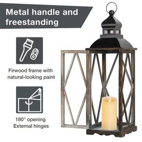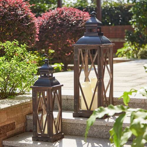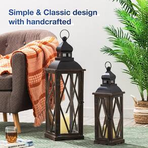 Glitzhome Pacote com 2 lanternas decorativas de madeira/metal para casa de fazenda vintage para pátio - mesa, preto (sem vidro) - Material premium – Feito de moldura de madeira de abeto natural com parte superior de metal preto, trava giratória e dobradiças premium conectadas. Com seu piso de metal galvanizado retardante de chamas no interior, ele fornecerá a você uma casa quente e segura ao acender com tipos de velas. - Design inspirado – janelas vazadas de diamante preto sem vidro, estilo casa de fazenda com acabamento exclusivo/envelhecido, crie facilmente um brilho acolhedor e convidativo em qualquer lugar da sua casa, varanda ou quintal. - Vendido como um conjunto de 2 tamanhos grandes – Cada lanterna mede da seguinte forma: a maior 24 cm C x 24 cm L x 72 cm A e a menor 15 cm C x 15 cm L x 52 cm A. - Velas combinando – a vela não está incluída. Adequado para vários tamanhos de velas de pilar, velas de luz de chá ou velas LED. - Multifuncional – É uma lanterna decorativa clássica quando as velas são acesas, e também pode ser vestida com uma incrível peça de decoração com plantas de vaso ou suculentas dentro. Como decoração de pé, decoração de mesa ou decoração de parede, é perfeito para você decorar sua casa ou na varanda da frente, pátio, deck ou em qualquer lugar que você gostaria de iluminar.
