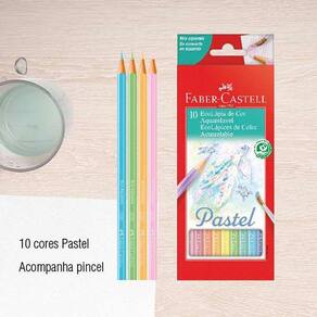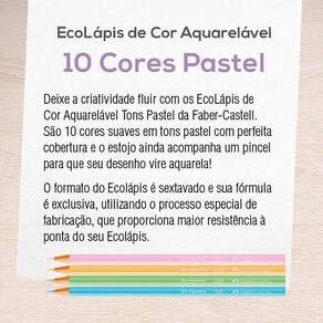 Deixe a criatividade fluir com os EcoLápis de Cor Aquarelável Tons Pastel da Faber-Castell. São 10 cores suaves em tons pastel com perfeita cobertura e o estojo ainda acompanha um pincel para que seu desenho vire aquarela! O formato do Ecolápis é sextavado e sua fórmula é exclusiva, utilizando o processo especial de fabricação TS - Técnica Sekural, que proporciona maior resistência à ponta do seu Ecolápis. ATENÇÃO: Não mergulhe os Ecolápis Aquareláveis na água. Certificado pelo FSC: respeito ao meio ambiente. Produto atóxico e validade indeterminada.