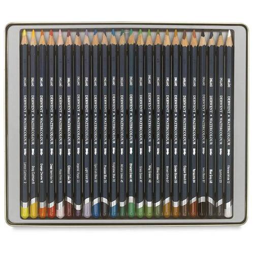 - Estojo de metal que contém lápis profissionais para aquarela da linha Watercolour, da Derwent