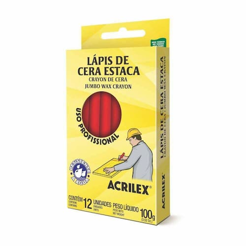 Lápis De Cera Estaca Vermelho Fogo Acrilex 507 Para Marcação de Madeira, Couro, Borracha, Cimento, Mármore e Granito . Não Tóxico, Não Mancha As Mãos, Frágil, Evite Quedas e Choques. Contém: 12 Unidades De Cor Unica. Composição: Ceras Cargas Minerais, Inertes E Pigmentos. Medida Aproximadamente: Comprimento: 7 cm Largura: 2,5 cm Altura: 13,5 cm INMETRO: REGISTRO 000239/2014 OCP0098
