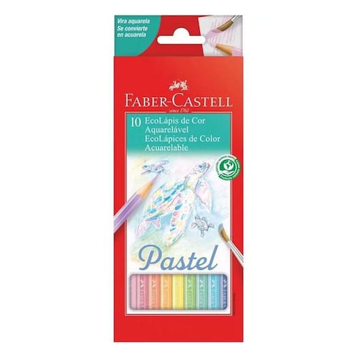 Com 10 cores delicada de tons pastel e a versatilidade da técnica aquarelável, o Lápis de Cor Ecolápis Aquarelável 120210P da Faber Castell é perfeito para dar um toque especial aos seus desenhos e ilustrações, deixando com efeitos suaves e elegantes, aproveite!