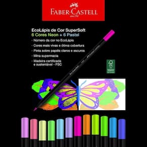 Com o lápis supersoft faber-castell você terá a melhor qualidade e um lindo resultado em seus trabalhos São 12 ecolápis de cor, sendo 6 cores neon, para iluminar seus desenhos e 6 cores pastel, dando um toque mais doce e delicado. Mina super macia exclusiva, garantindo o máximo de conforto ao pintar. Eles possuem cores mais vivas e com ótima cobertura, sobre papéis claros e escuros.