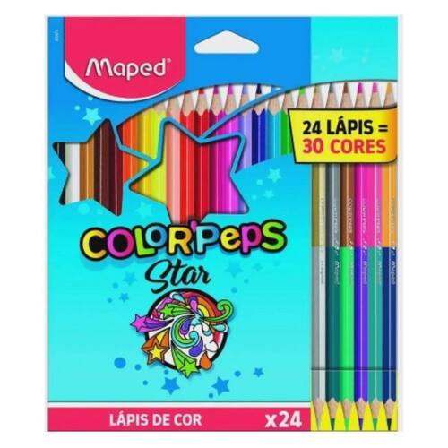 Lápis de Cor Triangular 24 lápis com 30 cores - 6 lápis de cor Duo Bicolor Maped Lápis de cor de madeira 24 lápis com 30 cores sendo 6 lápis bicolor. Lápis de cor Maped têm uma grafite durável e são fáceis de apontar para uso diário confortável e fácil. Eles têm uma forma triangular específica que facilita a aderência para recursos mais seguros. Lápis Maped estão em conformidade com os regulamentos de brinquedos para uso seguro. Cores vivas e intensas, em qualquer lugar, a qualquer hora, graças aos lápis da linha Color'Peps