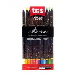 Lápis de Cor Tris Vibes 12 Cores Noturna A linha de Lápis de cor Noturna Vibes da Tris é para quem adora desenhar em casa ou deseja começar no mundo das artes; explorar combinações novas Com cores super pigmentadas, lindo design, textura ultra macia e cobertura intensa, com lindas cores para você escolher.