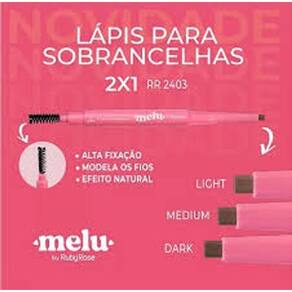 Lápis De Sobrancelha 2X1 Melu - Ruby Rose Cor: Medium Lápis de Sobrancelha 2x1 escovinha Melu by Ruby Rose Modo de usar: Deslize pela sobrancelha com a ponta chanfrada para preencher e modelar, passe a quantidade deseja para construir a cor. Com o outro lado esfume e penteie com a escovinha. Ean: 7900083001143