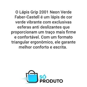 O lápis grip 2001 neon verde faber-castell é um lápis de cor verde vibrante com exclusivas anti deslizantes que proporcionam um traço mais firme e confortável. Com um formato triangular ergonômico, ele garante melhor conforto e escrita. O grafite preto do lápis é forte e preciso, permitindo uma escrita limpa e nítida. Feito em madeira macia e totalmente ecológico, o lápis é resistente e fácil de apagar. Além disso, as antideslizantes no corpo do lápis evitam que ele escorregue da mão, proporcionando uma experiência mais segura e agradável ao escrever. Em resumo, o lápis grip 2001 neon verde faber-castell é uma ótima opção para quem busca um lápis de qualidade e com um design moderno e ergonômico. As imagens são meramente ilustrativas Marca: Não Informado