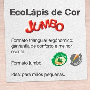 Detalhes do produto Deixe a criatividade fluir com os Ecolápis de Cor Jumbo da Faber-Castell Os ecolápis são formato Jumbo: ideal para mãos pequenas e estimula o desenvolvimento psicomotor das crianças O formato triangular ergonômico dos ecolápis garante conforto na pega, tornando o processo de aprendizagem muito mais divertido Produzido com madeira 100% reflorestada e certificada pelo FSC: respeito ao meio ambiente ATENÇÃO! Não recomendável para crianças de até 3 (três) anos, por conter parte(s) pequena(s) que pode(m) ser engolida(s) ou aspirada(s) Produto atóxico e não perecível Este produto pode ser reciclado