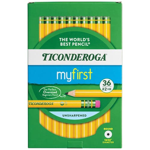Ticonderoga Lápis My First com revestimento de madeira, 2 HB, amarelo, 36 unidades - DESIGN ERGONÔMICO: Lápis de grandes dimensões (13/32") é ideal para crianças nos estágios iniciais de desenvolvimento da escrita - Fórmula de grafite nº 2 exclusiva: oferece desempenho extra suave enquanto o núcleo de grafite espesso proporciona linhas amplas e consistentes - MADEIRA PREMIUM: Feito de florestas de origem responsável, proporcionando afiação suave e uniforme com o mínimo de quebra - Seguro para crianças: certificado PMA não tóxico - Marca confiável: Ticonderoga faz parte da família de produtos Dixon Ticonderoga que inclui Prang, Dixon, Pacon, Tru-Ray, UCreate, Fadeless, Classroom Keepers, Bordette, Creativity Street, Spectra, Strathmore, Canson, Daler-Rowney, Lyra, Das, Maimeri, Princeton Artist Brush e muito mais