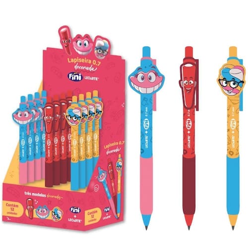Lapiseira 0.7mm decorada fini - 1 unidade - leoarte Lapiseira 0.7mm decorada fini - 1 unidade - leoarte Ainda mais doce e colorido. É assim que vai ser escrever ou desenhar com a lapiseira 0.7 decorada fini - leoarte, porque com ela a criança realiza as tarefas, aprende, cria, brinca e se diverte. Tudo porque ela é uma lapiseira que possui 3 estampas diferentes dos personagens fofos e coloridos da fini, a gigante mundial dos doces. Para ficar tudo ainda mais alegre ainda vem com aplique de silicone estampado dos personagens na altura da tampa. Sua ponta é de 0.7 mm, ideal para uso estudantil e , ou seja, para as mais variadas finalidades. Seja na escola, na faculdade ou no escritório, a lapiseira 0.7 decorada fini propicia alta performance e grande desempenho, cheia de beleza, criatividade e muita doçura Detalhe do produto: Lapiseira grafite; Ponta: 0.7mm; Com aplique de silicone estampado da ; 3 artes diferentes no display; Formato redondo; Certificado inmetro; Composição: corpo, clipe e ponta: as. Tampa da borracha: mbs. Tubo de recarga: pp. Grip: silicone. Mola: aço. Inmetro: ocp 0116 registro: 001591/2025 Após a compra, envie uma mensagem com o modelo desejado. Se tivermos em , enviaremos o que você pediu. Marca: Não Informado