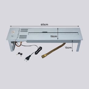 • Tamanho: 60 cm (c) x 15 cm (a) x 15 cm (l); • Queimador linear: 37 cm | 1 linha de fogo; • Área de aquecimento: 20 m² - Considerando pé direito de até 2.80m; • Consumo de gás: 350 g/h; • Peso: 7,5 kg; • Acabamento: cinza fosco | tinta especial para altas temperaturas; • Material: aço carbono; • Acendimento: manual com faísca elétrica (igual a um forno a gás); • Dispositivo de Segurança: Termopar – Sistema que corta o gás na ausência do fogo, semelhante a um forno a gás; • Voltagem: bivolt • Ambiente para uso: interno - protegido do sol e intempéries • Regulagem de chama: 5 níveis de altura • Pedras vulcânicas inclusas para decoração • Instalação: Uso embutido (semelhante a um cooktop); • Chaminé: Recomendado somente quando o tamanho da lareira não estiver de acordo com tamanho do ambiente. Sempre é necessário ter uma janela no mesmo ambiente para deixar um fresta aberta para renovação do ar; o de lei ou dormente. A chama da lareira é real. Acima da lareira deve ter uma área livre de no mínimo 60cm de altura para ventilação;