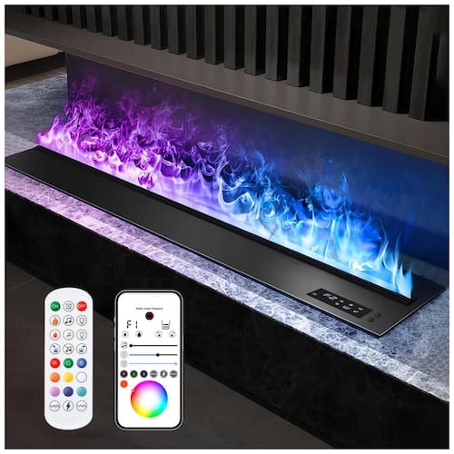 A lareira elétrica de vapor Mexhom bl-b80 é um inserto recuado que simula chamas por atomização de água, com efeitos multicolores RGB em 9 configurações. Serve para decoração de ambientes internos como salas de estar ou centros de entretenimento, utilizando LED e água purificada ou filtrada para efeito visual sem aquecimento.