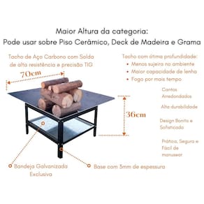 Lareira Externa 60cm Aquecedor - Jardim Fire Pit A Lenha Lareira Portátil Quadratta 60cm e 35cm altura Mais alta da categoria . Fabricada em chapa grossa de Aço Carbono 1020. Pode ser usada sobre piso Cerâmico, Deck de Madeira e Grama Base com pintura especial para altas temperaturas Bandeja Galvanizada Exclusiva de proteção para o piso e para pré assar alimento. Tacho com ótima profundidade na cor bruta do metal. Solda especial TIG de alta resistência e acabamento - fio a fio Tacho seguro com cantos arredondados Prática, e com excelente durabilidade. Lareira somente para ambientes externos como Jardins, quintal ao ar livre, chácaras, pousadas, hotel fazenda, etc. Pode ser utilizada sobre Deck e Piso Frio. Temos este modelo Quadratta em vários tamanhos: 60cm, 70cm, 80cm,90cm e 100cm. Ideal para fazer uma fogueira controlada, sem sujeira para aquecer o ambiente e criar um clima sofisticado, alegre e aconchegante em família e amigos. Utiliza-se Lenha, Carvão, Briquete, Pedras Vulcânicas e outros. Quem mora em apartamento com sacada pode usar carvão que não faz fumaça. Use-a para bater um papo com os amigos, tocar um violão ao redor da fogueira, tomar um bom vinho, assar Marshmallows e o que imaginar. - Fotos meramente ilustrativas, atentar-se para dimensões informadas.- Devido ser fabricado em ferro, evitar o contato com água....- Não acompanha lenha.- Cuidado e atenção total com crianças- Manusear a lareira somente com luvas térmica- A base aquece com o calor da fogueira- Com o fogo a tonalidade de cor do tacho irá alterar O que acompanha: 01 Tacho com chapa grossa de 2.0mm de espessura01 Base montável - Pintura especial altas temperaturas 01 Bandeja Galvanizada Exclusiva Medidas da Lareira Montada: Largura: 60cmComprimento: 60cmAltura total: 35cmPeso: 10,5 kgCor Base: Preto FoscoTacho: Na cor bruta do metal Marca: Lazer E Você