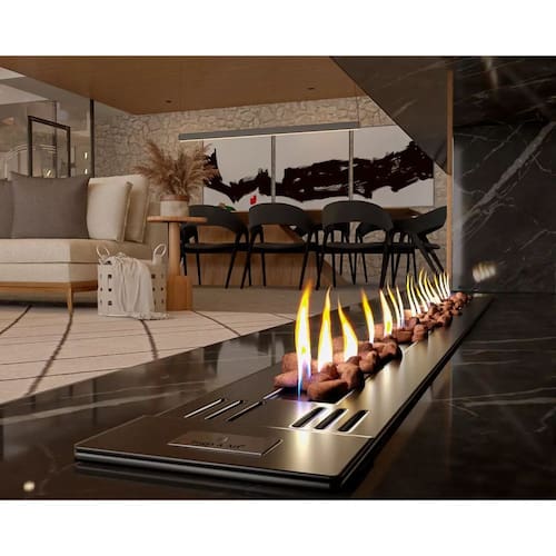 Tamanho: 120 cm (c) x 15 cm (a) x 15 cm (l); Queimador linear: 97 cm | 1 linha de fogo; Área de aquecimento: 80 m² - Considerando pé direito de até 2.80m; Consumo de gás: 576 g/h; Peso: 14 kg; Acabamento: preto fosco com leve textura | tinta especial para altas temperaturas; Material: aço carbono; Acendimento: manual com faísca elétrica (igual a um forno a gás); Dispositivo de Segurança: Termopar – Sistema que corta o gás na ausência do fogo, semelhante a um forno a gás; Voltagem: bivolt; Ambiente para uso: interno - protegido do sol e intempéries; Regulagem de chama: 5 níveis de altura; Pedras vulcânicas inclusas para decoração; Instalação: Uso embutido (semelhante a um cooktop); Chaminé: Recomendado somente quando o tamanho da lareira não estiver de acordo com tamanho do ambiente ; Cheiro: Toda lareira a gás, a álcool ou a lenha possui chama real e por consequência um cheiro característico. A lareira a gás quando instalada corretamente, ao ser acesa irá gerar um cheiro leve que não irá incomodar; Pressão de gás: Baixa pressão 2kg; Tubulação de gás: Mínimo de ½” (polegada), deixar rosca macho no interior do nicho; Nicho: Instalar em granito ou alvenaria, caso utilize mármore, consulte o seu marmorista para a escolha da pedra ser resistente ao calor. NUNCA utilize MDF e não recomendamos madeira mesmo de lei ou dormente. A chama da lareira é real. Acima da lareira deve ter uma área livre de no mínimo 60cm de altura para ventilação; Manual: Fale com um especialista e receba o manual completo de instalação. Nos envie seu projeto para receber atendimento personalizado e prevenir imprevistos;