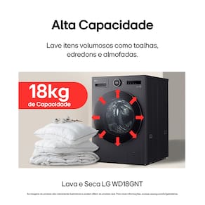 18kg para lavagem e 10kg para secagem, ela é perfeita para famílias grandes ou para quem precisa lavar peças volumosas como edredons com eficiência.
