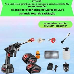Descrição do produto este produto será enviado com duas baterias de 96v, uma maleta e o kit completo de acessórios, para usar na lavadora Lavadora portátil de segunda geração, movida à bateria recarregável Apresentamos a lavadora de alta pressão portátil, com 2 baterias de 96v recarregáveis. Transforme a sua experiência, com esta lavadora. Ideal para você, que precisa realizar tarefas de limpeza de forma rápida, prática e econômica, este produto oferece qualidade e eficiência que você pode confiar. A lavadora de alta pressão portátil é uma excelente escolha para quem busca praticidade e eficiência nas tarefas de limpeza. Por ser movida à bateria recarregável, ela oferece mobilidade e facilidade de uso, permitindo que você a utilize em diferentes locais sem a necessidade de uma fonte de energia fixa. Além disso, seu design ergonômico e moderno torna o manuseio mais confortável. É uma ferramenta versátil e indispensável, que pode ser utilizada em diversas situações, como na limpeza de carros, calçadas, móveis de jardim e muito mais. Não fique sem bateria na execução dos serviços do dia a dia. Recuse promessas falsas de baterias com amperagem e voltagem acima do que realmente são. As nossas lavadoras e baterias são de ótima qualidade e seguem os valores dentro dos padrões reais. Atenção ao primeiro uso da lavadora. Recomendamos que você inicie o uso conectando o produto diretamente à torneira, a fim de expelir o ar do sistema. Após essa etapa, você poderá utilizá-lo normalmente em qualquer balde. Lembre-se de que é essencial realizar uma carga inicial completa de 6 horas antes de utilizar o produto. Após apertar o gatilho por alguns segundos, os primeiros jatos começarão a sair imediatamente. Bateria de última geração Equipada com tecnologia de bateria de lítio, a nossa lavadora irá superar as suas expectativas. Versatilidade inigualável A solução que você sempre buscou finalmente está aqui. Conheça a lavadora portátil perfeita para as suas tarefas de limpeza. Design ergonômico e portabilidade Com um design ergonômico e uma aderência confortável, nossa lavadora oferece uma experiência de uso sem igual. Além disso, é leve e portátil, ideal para acompanhar você em qualquer lugar. Ficha técnica: - dimensão: 24x24x14cm - bateria lítio - potência: 1.000w - pressão: 32 bar - material plástico abs + componentes elétricos de metal - tensão do carregador: 110v/220v - tempo de carga: até 3 horas - tempo de uso: até 2 horas - bocal de alta pressão - funcionalidade: 3 tipos - níveis : desde lavar carros a regar plantas multiuso - consumo: 4 litros de água / minuto Cuidados e recomendações: Este produto é portátil, portanto, sua potência pode variar em comparação aos modelos conectados à rede elétrica. Recomendamos considerar este fato antes da compra. Não ligue a unidade sem água. Evite quedas. Não desmonte o produto. Itens inclusos: 1x lavadora 1x maleta 2x bateria de 96v 1x ponteira de metal 1x mangueira de 5 metros 2x bicos 1x adaptador para mangueira de jardim 1x conector de engate rápido 1x carregador de bateria 1x filtro 1x recipiente para sabão de 300ml Não perca a chance de transformar sua experiência de limpeza. Adquira sua lavadora de alta performance hoje mesmo e descubra o verdadeiro poder de uma limpeza sem limites.