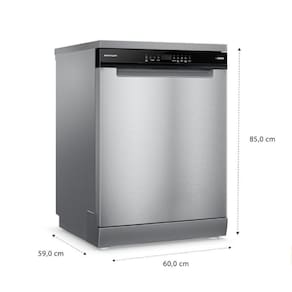 Capacidade para 14 serviços, acabamento em inox, pés ajustáveis, potência de 860W, funcionamento em 220V, dimensões 85x60x59 cm, peso 50 kg.Programas de lavagem
