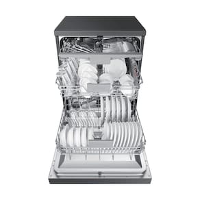 Lava-louças Samsung 14 serviços com cuba de aço inoxidável, baixo nível de ruído (menos de 46dB), ciclo automático, função de secagem rápida com abertura automática da porta, e função de higienização com água a 70°C.Programas de lavagem