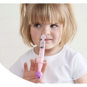 Modo de usar: adicione de 5 a 10 ml de soro fisiológico em emperaura ambienena seringa. Com o bebê sentado e o ronco ligeiramente inclinado para frente, inroduza suavimente a ponteira de silicone na narina e aplique o liquido, que entra por um lado e é drenado pelo outro.
