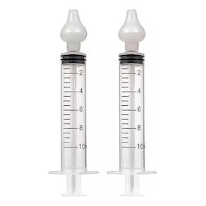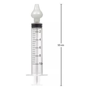 Modo de usar: adicione de 5 a 10 ml de soro fisiológico em temperatura ambiente na seringa. Com o bebê sentado e o tronco ligeiramente inclinado para a frente. Introduza suavemente a ponteira de silicone na narina e aplique o líquido que entra por um lado e é drenado pelo outro.