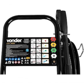 1 Lavadora de alta pressão. Acompanha: 1 pistola, 1 lança, 1 bico turbo, 5 bicos, 1 mangueira de alta pressão, 1 mangueira e 1 filtro para shampoo.