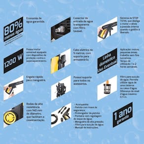 Acompanha: bico de alta pressão com trava, prolongador de bico, ponteira para regular o jato de saída de água, mangueira de alta pressão, filtro para sucção de água e manual de instruções.